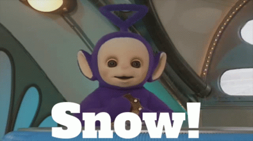 Tinky Winky from Teletubbies, the purple character, smiles and excitedly exclaims 'Snow!'.