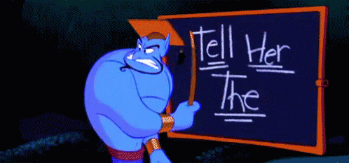 Genie from Aladdin dramatically reveals the word "TRUTH" on a blackboard, emphasizing honesty.