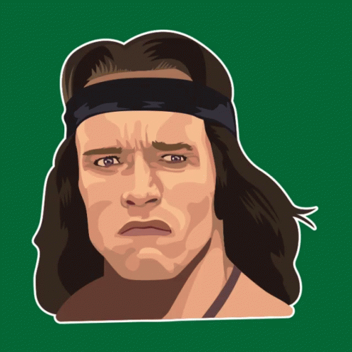 Arnold Schwarzenegger as Conan the Barbarian looking suspicious with 'MMMMMM' text appearing above his head.