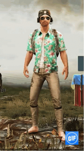 The Balayya character from PUBG, dressed in a Hawaiian shirt and headphones, performs a friendly waving emote.