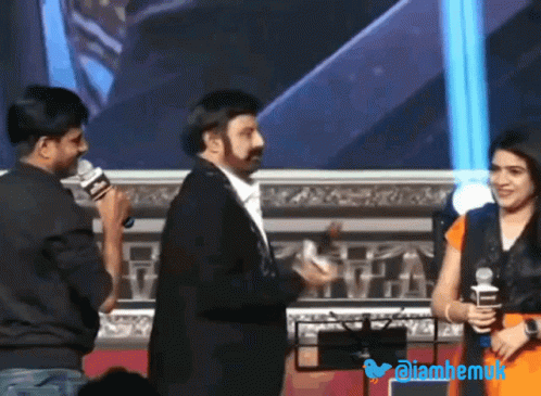 A man and woman on stage at a Telugu film event, with a large screen displaying "HIGHEST NBK GROSSER FOR".
