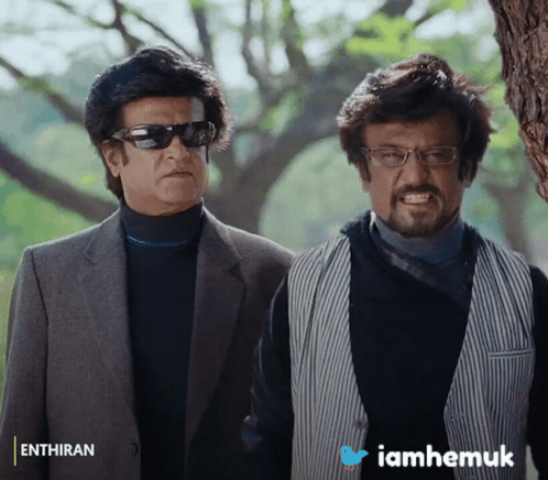 Rajinikanth as Chitti and Vaseegaran in a scene from Enthiran, with iamhemuk branding.