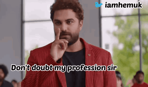 A man in a red suit emphatically states, 'Don't doubt my profession sir,' from iamhemuk.