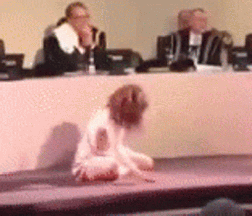 A woman in a white dress throws a dramatic temper tantrum on a stage during a formal event.