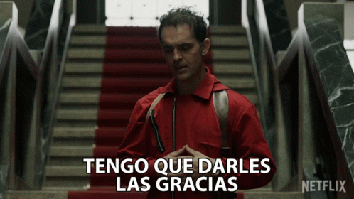 Berlin from La Casa De Papel in a red suit, expressing gratitude with 'Tengo Que Darles Las Gracias'.