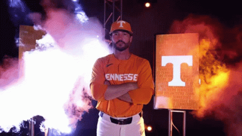 Tennessee Baseball Coach Tony Vitello stands with arms crossed in an orange jersey.
