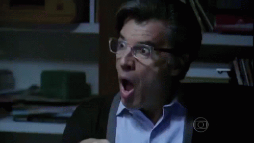 Téo Pereira from the telenovela Império reacts with a dramatically surprised expression, wearing glasses and suspenders.