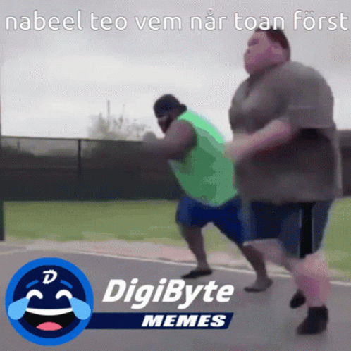 Teo and Nabeel in a humorous running race on a basketball court, a popular DigiByte meme.