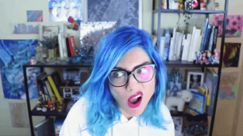 Ter Chao, a woman with vibrant blue hair, glasses, and red lipstick, looks directly at the camera in her creative space.