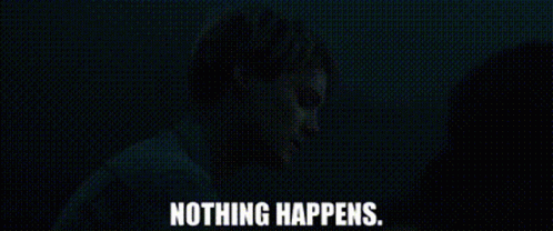 Grace Harper (Mackenzie Davis) in a dark scene from Terminator Dark Fate, with the ominous text 'NOTHING HAPPENS.' displayed.
