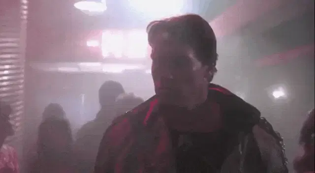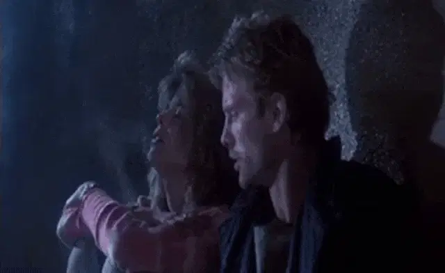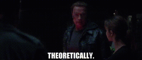 a man and a woman are standing next to each other in a dark room and the man is saying `` theoretically '' .