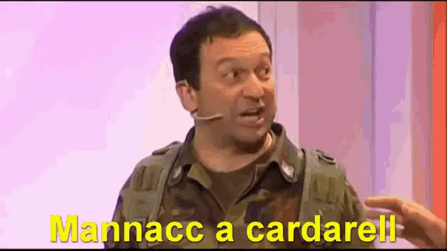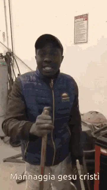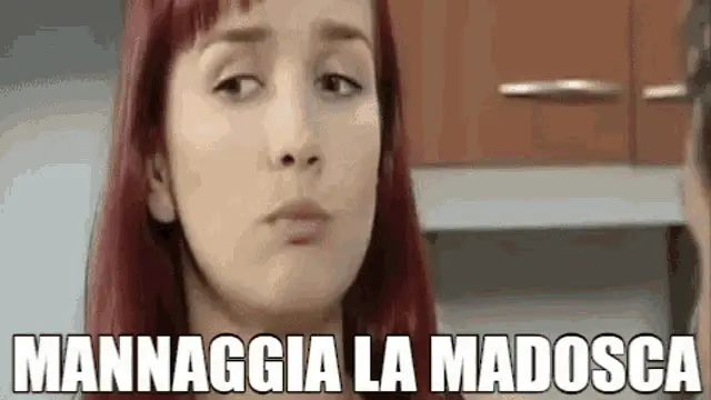 Paolo Bonolis on stage, exclaiming 'Mannaggia la miseria' and 'E adesso che facciamo?' during a TV show.