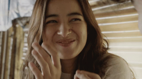 Mawar De Jongh laughing happily, covering her face shyly in a close-up shot.