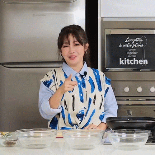 Marinka laughs joyfully in a kitchen, standing in front of a sign that reads 'Laughter & wild plans come together in this kitchen'.