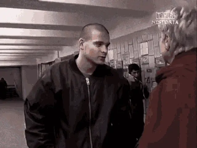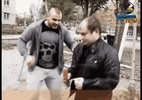 Maxim Martsinkevich, known as Tesak, dances with another man in a park, wearing a skull shirt.
