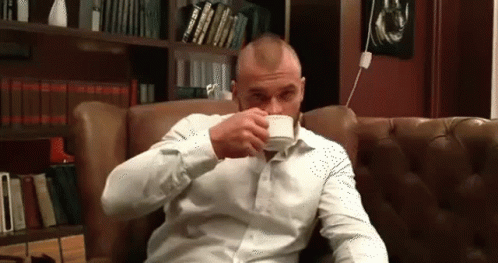 Tesak, a man with a shaved head, drinks from a white mug while sitting in a brown leather chair.