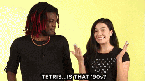 A man and woman discuss if Tetris is a 90s game, with the woman asking 'TETRIS... IS THAT '90S?'