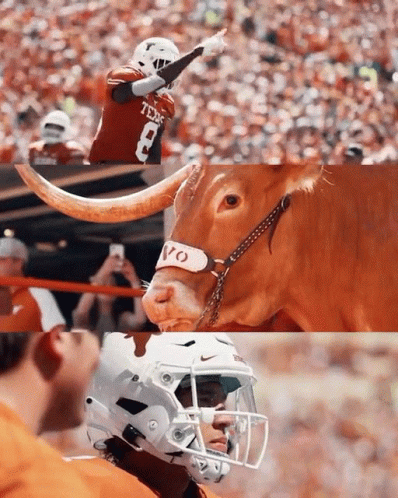 Dynamic scenes of Texas Longhorns football, featuring players and the iconic mascot, Bevo the steer.