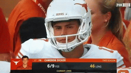 Cameron Dicker, Texas Longhorns kicker, smiles on the sideline with his season stats displayed.