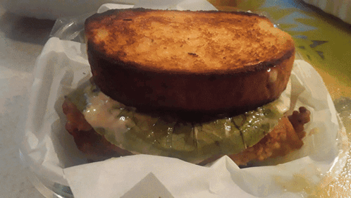 A close-up of a Texas Tornado Chicken Sandwich featuring toasted bread, a fried chicken patty, and green toppings.