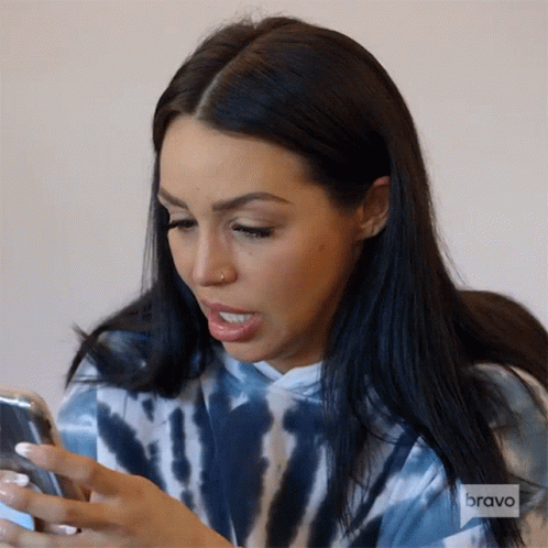 Scheana Shay from Vanderpump Rules intently looks at her phone, wearing a tie-dye hoodie, reacting to a message.