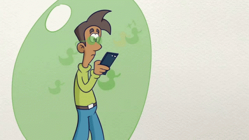 A cartoon man intently looks at his smartphone, surrounded by small green ducks, inside a translucent bubble.