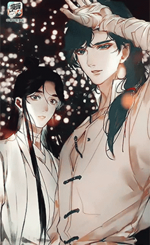 Hua Cheng and Xie Lian from Tian Guan Ci Fu (TGCF) in a beautiful animated scene with sparkling lights.