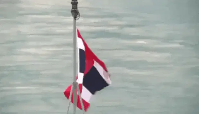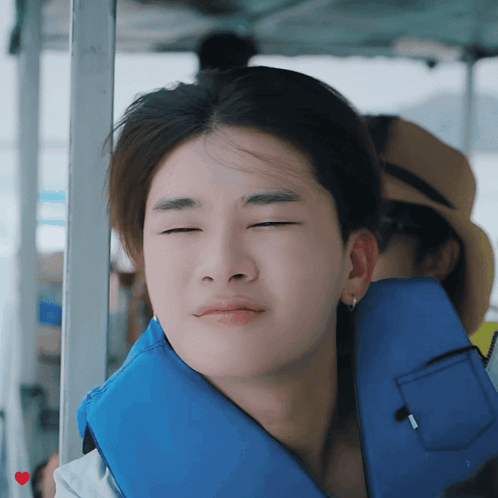 Thaichayanon Thaibus squints his eyes shut while wearing a blue life vest on a boat.