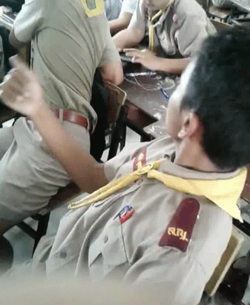 A young Thai scout in uniform smiles at the camera while sitting in a classroom.