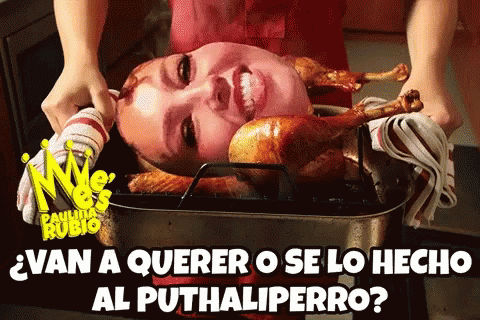 Paulina Rubio presents a roasted turkey with Thalia's head, asking 'Are you going to want it or should I throw it to the Puthali-dog?'