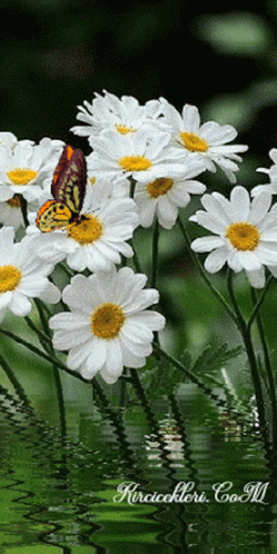 A beautiful orange and black butterfly is perched delicately on a white daisy flower in a vibrant garden.