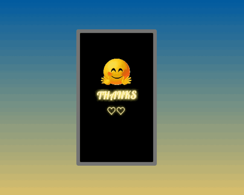 A glowing yellow emoji with outstretched arms and 'THANKS' text, accompanied by two hearts, on a phone screen.