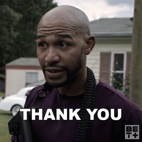 Blue Kimble, holding a gun, says 'Thank You' to Andrew, with the on-screen caption 'THANK YOU'.