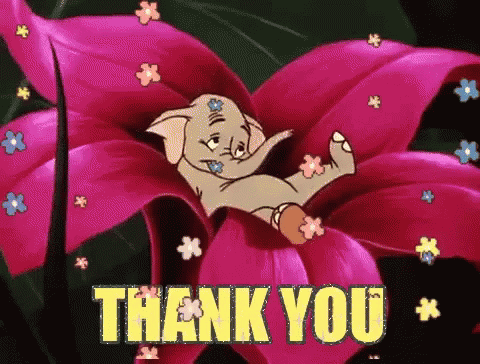 Dumbo, the cartoon elephant, relaxes on a vibrant pink flower with small colorful blossoms, expressing gratitude with 'THANK YOU'.