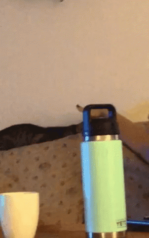 A woman laughs happily on a couch with a cat, a green Yeti water bottle on a table nearby.