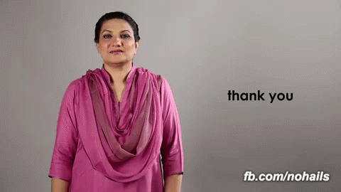 A woman demonstrates 'thank you' in Pakistan Sign Language, wearing a traditional pink outfit.