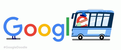 Google Doodle animation celebrating and thanking public transit workers with a bus and hearts.