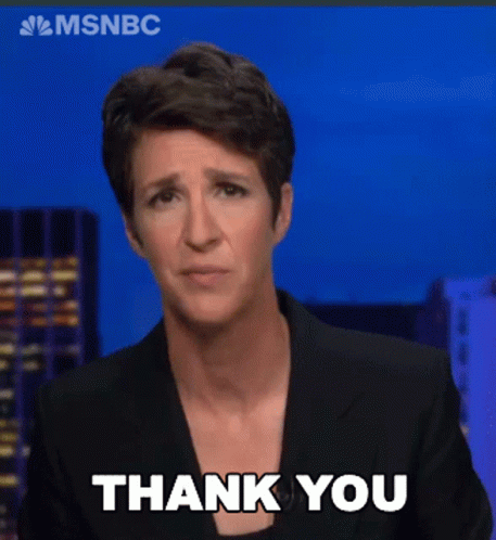 Rachel Anne Maddow expresses gratitude on MSNBC with a 'Thank You' message.