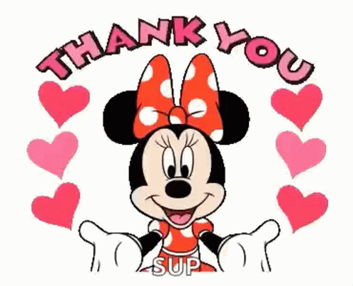 Minnie Mouse expresses 'Sup' then 'Thank You' with a heart, opening her arms in a sweet gesture.