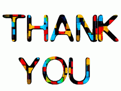 Vibrant, animated 'THANK YOU' message with colorful, block-like letters appearing and shifting.