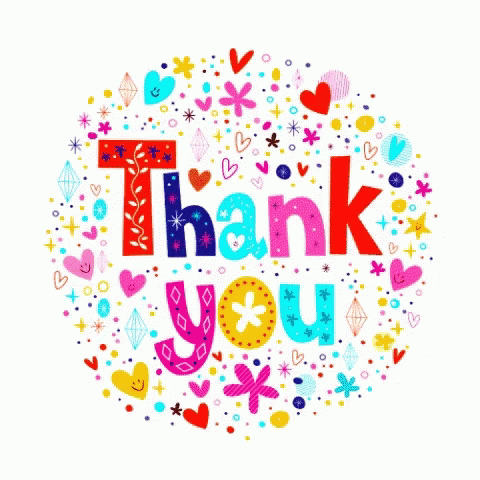 A vibrant animated 'Thank You' greeting card featuring colorful letters, hearts, flowers, and sparkling effects.