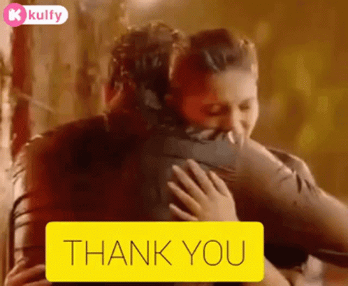 A couple shares a warm hug with a 'Thank You' message displayed on screen.