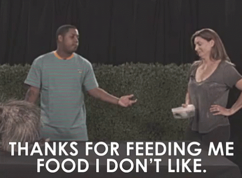Jasper Dolphin sarcastically reacts to being fed food he doesn't like, making a funny face.