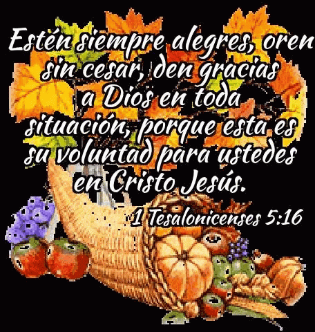 A vibrant Thanksgiving image featuring a cornucopia of harvest produce and a Spanish Bible verse.