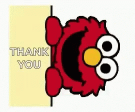 Elmo, the beloved character from Sesame Street, peeks out from behind a yellow 'THANK YOU' sign.