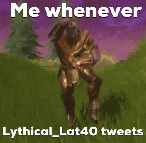 Thanos performs the 'Take The L' dance in Fortnite, captioned 'Me whenever Lythical_Lat40 tweets'.