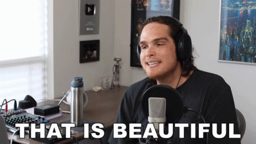 Sam Johnson, wearing headphones, smiles and exclaims, 'That is beautiful,' in a studio setting.