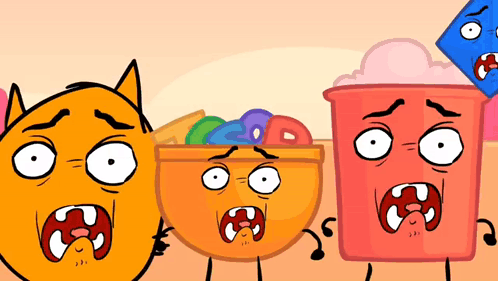 Cartoon characters, including a cat, cereal bowl, and ice cream bucket, react with disgust.
