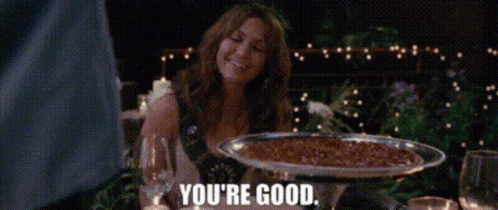Jennifer Lopez as Zoe in The Back Up Plan, smiling and saying 'You're good' while being served food.