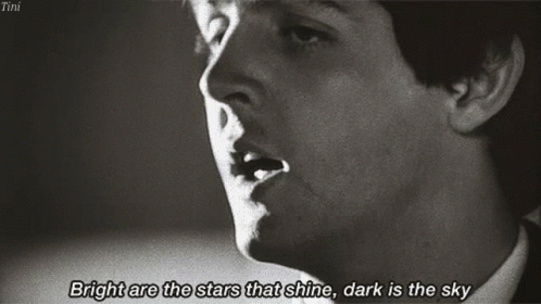 Paul McCartney of The Beatles sings 'And I Love Her' with lyrics 'Bright are the stars that shine, dark is the sky'.